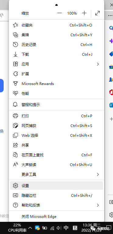 1、打开edge浏览器,点击edge浏览器右上角三个点的图标开启edge的菜单,在弹出的界面中选择【设置】来打开设置界面。