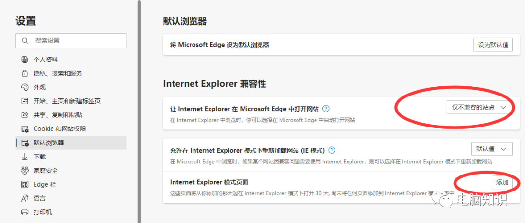 3、因为需要使用IE浏览器打开的兼容网站现在并不多,接下来需要做如下的设置改变。将【允许在 Internet Explorer 模式下重新加载网站】后的值选择更改为【允许】。完成下面的更改后,需要重启下edge浏览器。点击下方的【重启】来重启edge浏览器。点击【添加】按钮进行网页添加,添加后的页面将以IE兼容模式打开,这样下次打开该网页时就会自动以IE兼容模式打开了。