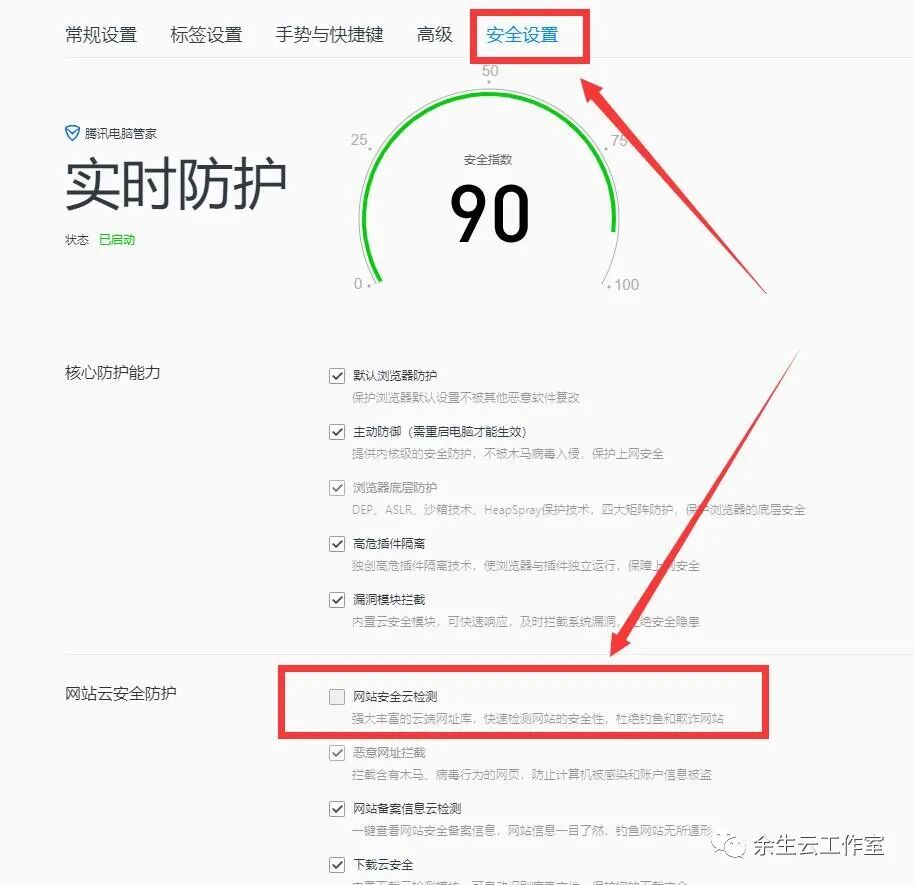 2、如果左上角显示危险网站:在网址栏点击危险状态->安全防护设置->关闭网址云安全即可