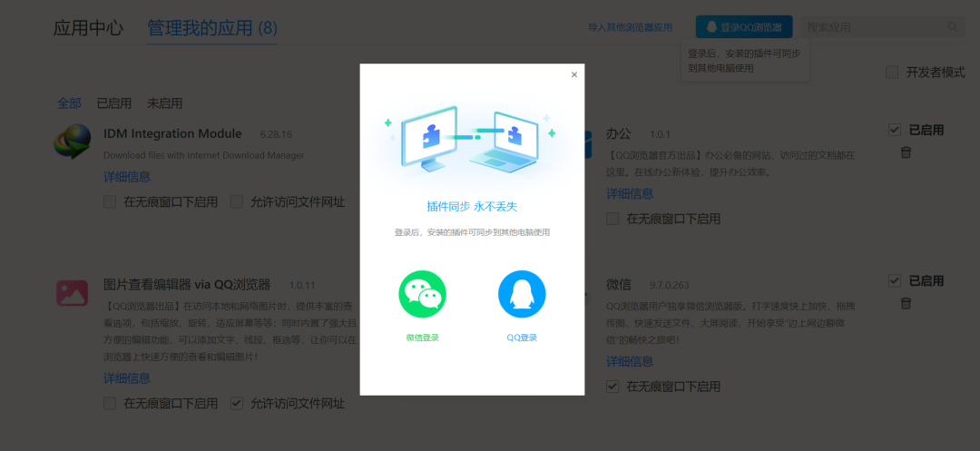 QQ 浏览器支持使用QQ或微信账号登录,登录后它可以将本地的书签、安装的插件保存到云端,当你在其他设备上登录相同的账号,它会自动进行同步。