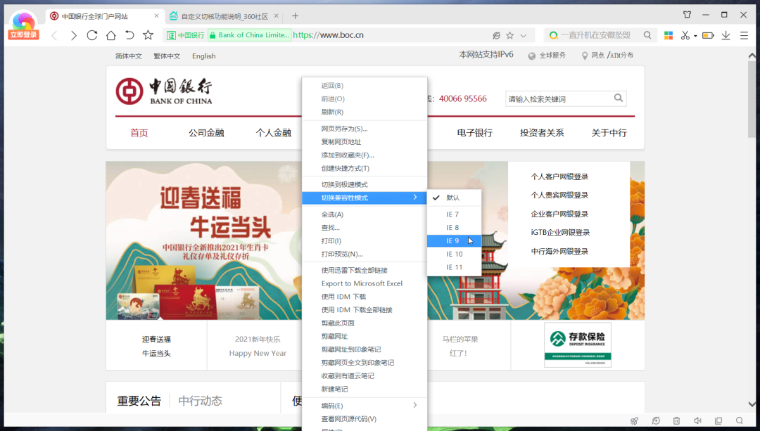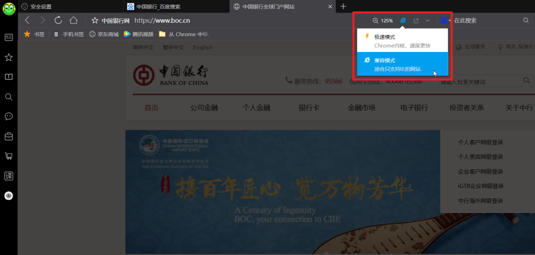 考虑到有些老旧的网站存在兼容性的问题,只有在IE 浏览器中才能正常使用,例如一些国有银行的网站,许多国产浏览器都带有自动切换内核模式的功能。