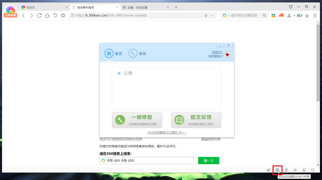 点击浏览器右下角的第二个图标,启动「360 断网急救箱」,选择「一键修复」,等待浏览器自动进行修复,完成修复后重启浏览器,上不了网的问题一般就可以解决了。