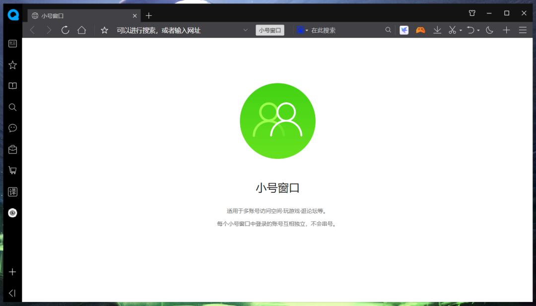 QQ 浏览器的小号窗口就可以很好地解决这个问题,它让我们无须安装多个浏览器,在小号窗口中登录的账号互相独立,不会串号,不会出现一个账号登录后另一个账号自动退出的情况。