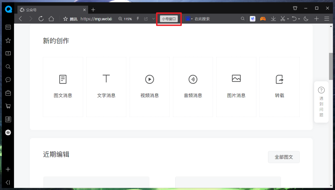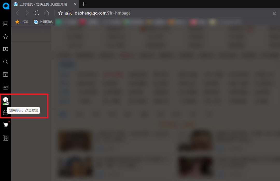 在 QQ 浏览器中使用微信,需要先点击左侧栏的微信图标,在浏览器中安装微信插件。