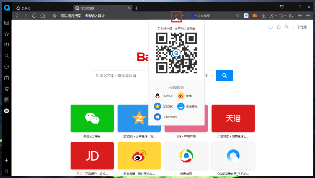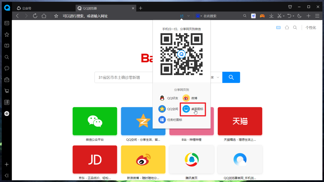 此外,QQ 浏览器还支持将常用的网站添加桌面,选择分享按钮中的「桌面图标」,它会在桌面上生成网站的快捷方式。