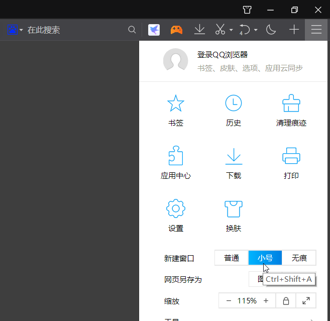 使用小号窗口功能也非常方便,点击浏览器右上角的更多设置,「新建窗口」有三个选项,选择其中的「小号」,或者直接使用快捷键Ctrl+Shift+A,快速创建小号窗口。