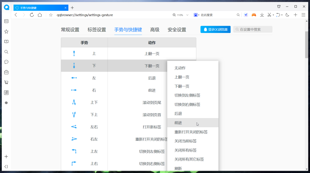 如果你想更换手势对应的动作,可单击手势或动作,在弹出的菜单中,设置鼠标手势对应的新动作。