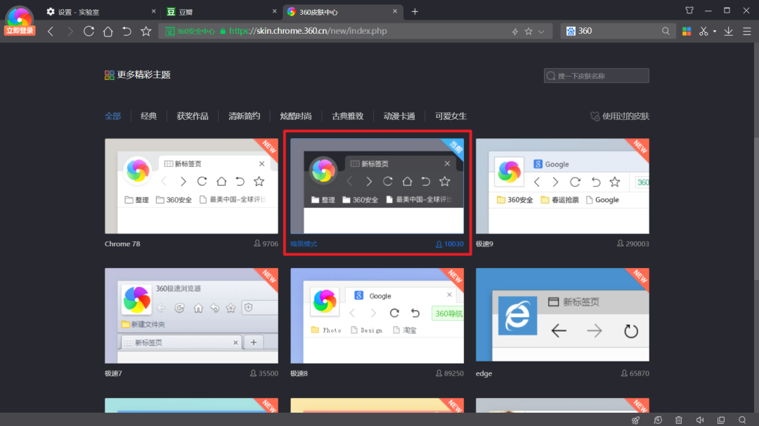 浏览器会打开新的标签页「360 皮肤中心」,滑动到下方的「更多精彩主题」,选择「暗黑模式」,浏览器会自动从原先的白色切换为深色模式。