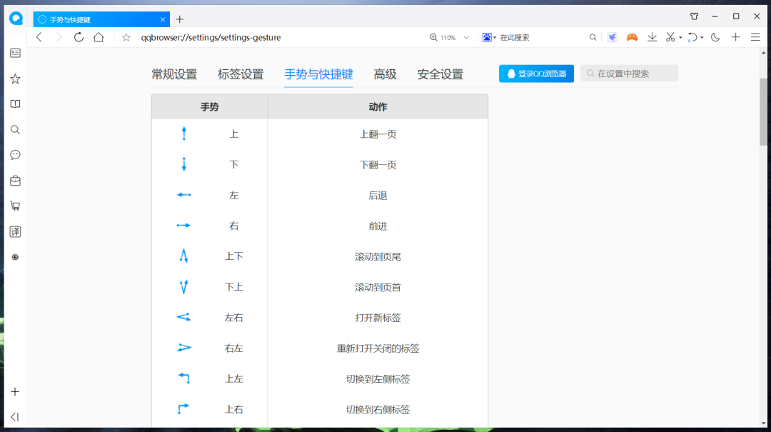 QQ 浏览器的手势与动作的对应关系如下图,例如当你用鼠标右键画出向上的箭头 ↑时,对应「上翻一页」的操作。