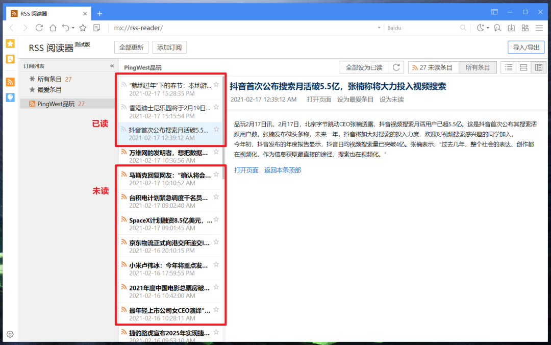 此外,RSS 阅读器会以标题字体的粗细来区分已读和未读的内容,若标题字体为细体,代表资讯已读,相反则代表资讯为未读状态。
