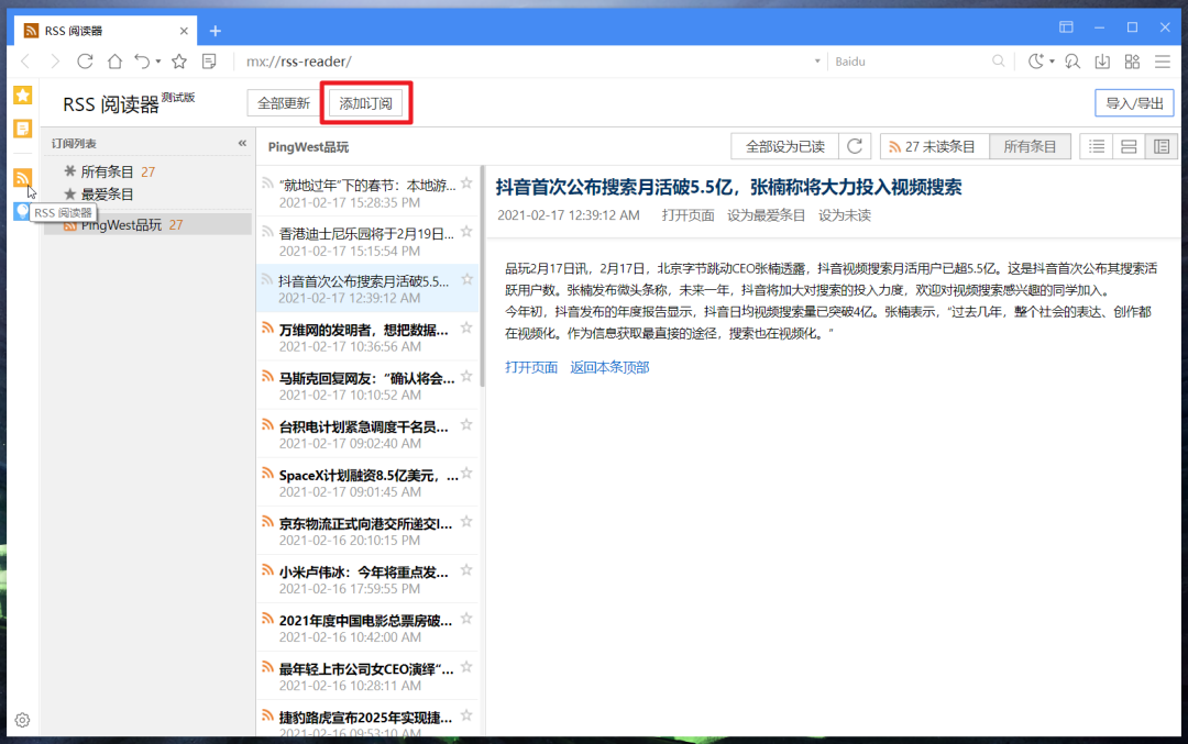 如果你喜欢的网站或博客提供了 RSS 订阅链接,可通过「添加订阅」将其添加到 RSS 阅读器中,每当网站或博客更新时就能及时获得通知。