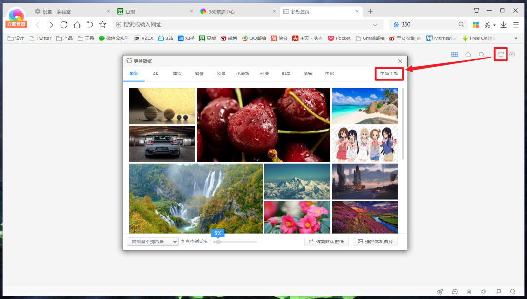点击新标签页右上角的「更换皮肤」按钮,打开更换壁纸的页面,选择「更换主题」。