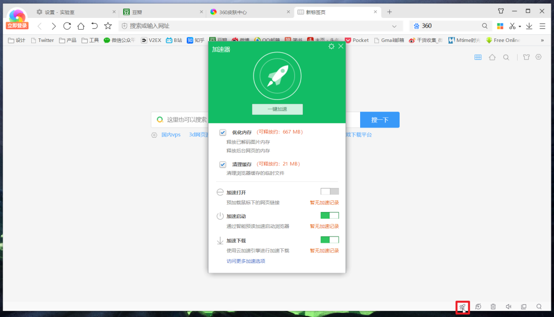 点击浏览器右下角的第一个「火箭」图标,打开加速器面板,点击「一键加速」,可以优化运行内存和清理缓存。