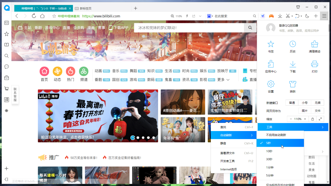 自动刷新网页,这是我在 QQ 浏览器中意外发现的一个功能,原先在 Chrome 中需要安装插件才能实现的能力,QQ 浏览器直接内置了。