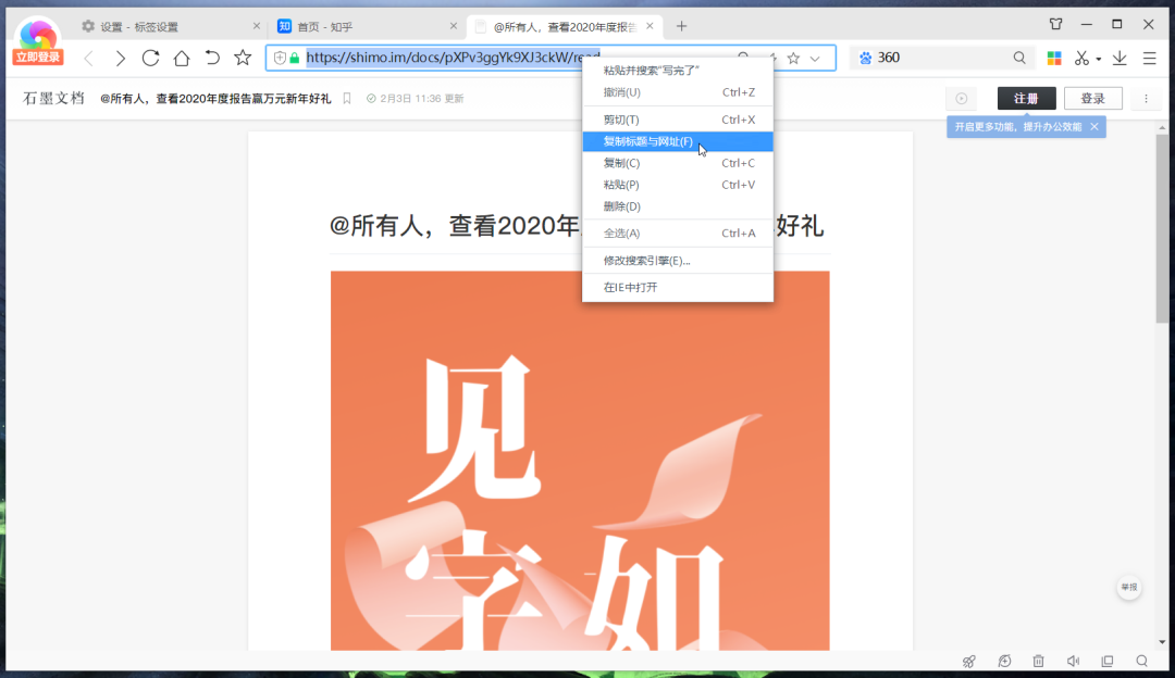 360 极速浏览器提供的「复制标题与网址」,则可以很好地解决这个问题。右击浏览器地址栏,在弹出的菜单中,选择「复制标题与网址」。