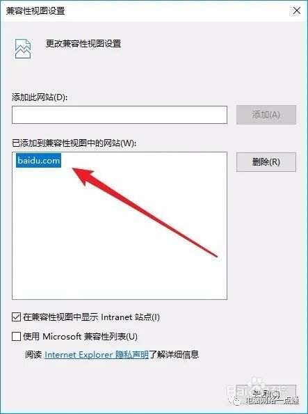 5、这时可以看到刚刚的网址添加到下面的兼容性视图列表中了。