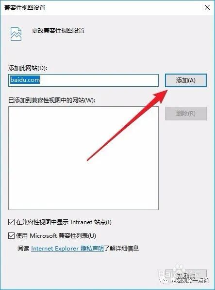 4、这时就会打开兼容性视图设置,在设置窗口中我们点击添加按钮,把当前的网址添加到列表中,也可以在前面的文本框中输入要添加的网址一起添加。