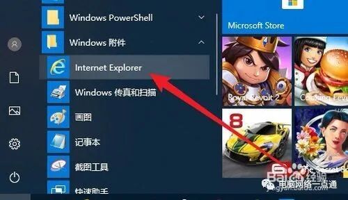 1、在Windows10系统桌面,我们依次点击开始/Windows附件/Internet Explorer菜单项。
