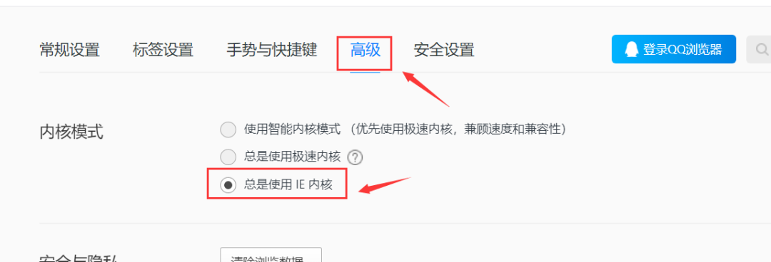 ?教程:1️⃣打开浏览器右上角的三条杠,2️⃣打开设置,3️⃣找到高级,4️⃣设置总是使用IE内核