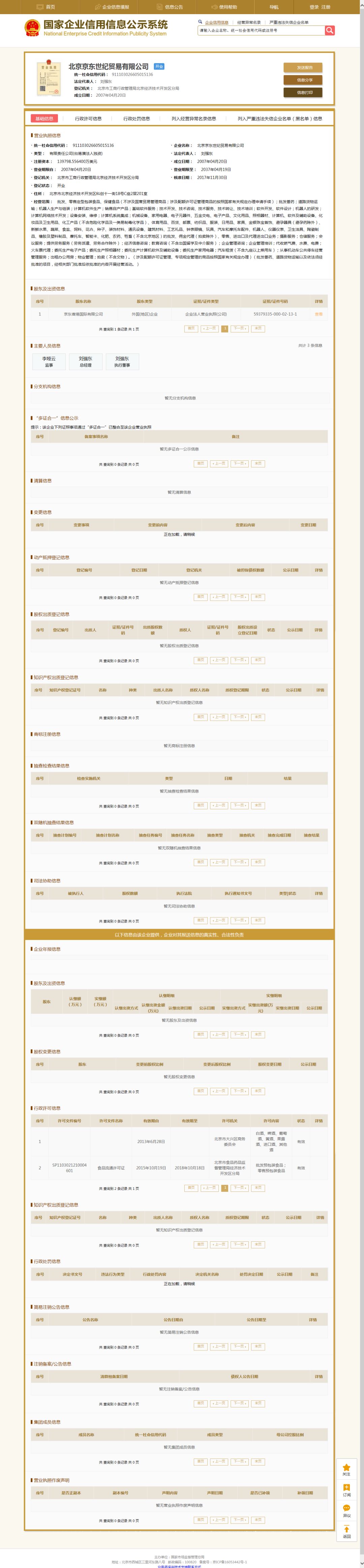 此处以国家企业信用信息公示系统关于北京京东世纪贸易有限公司公示网页和企查查关于北京京东世纪贸易有限公司关于北京京东世纪贸易有限公司的显示信息网页为例进行展示。