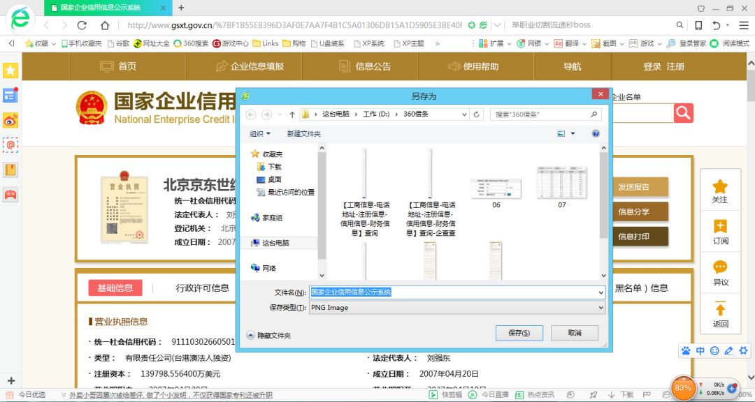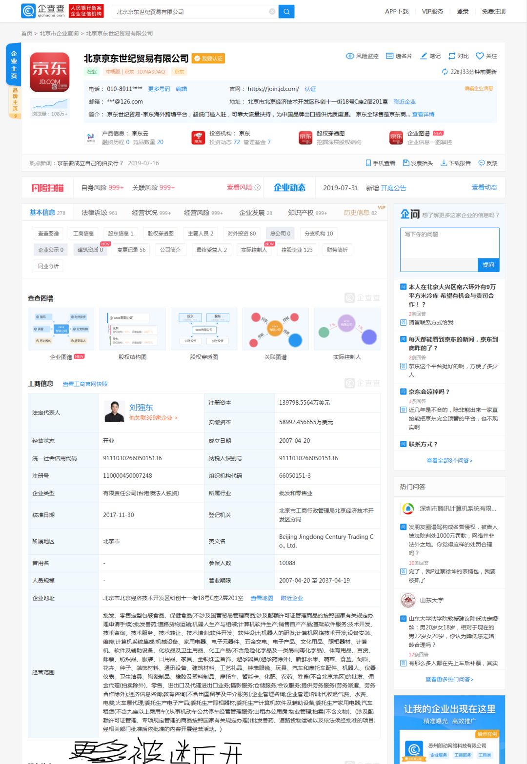 同样的操作,保存企查查关于北京京东世纪贸易有限公司关于北京京东世纪贸易有限公司的显示信息网页的图片(截取部分)。