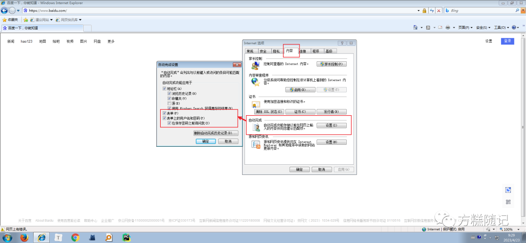 在打开的Internet选项中找到内容,再点击内容中的自动完成选项,找到设置,在打开的设置中勾选上表单(根据个人需要)、表单上的用户名和密码(必选)、在保存密码之前询问我(必选)