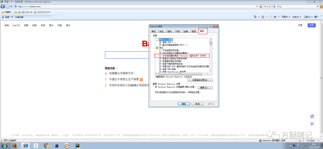 再切换到高级页面,取消勾选关闭浏览器时清空 "Internet 临时文件" 文件夹,然后点击确定