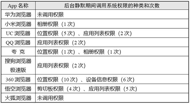 (4)在后台静默场景中,调用系统权限种类最多的为 UC 浏览器、夸克、360 浏览器、悟空浏览器(均为 2 类),调用系统权限次数最多的为 360 浏览器(16 次)。具体情况如表 5。