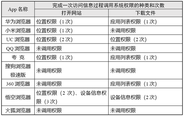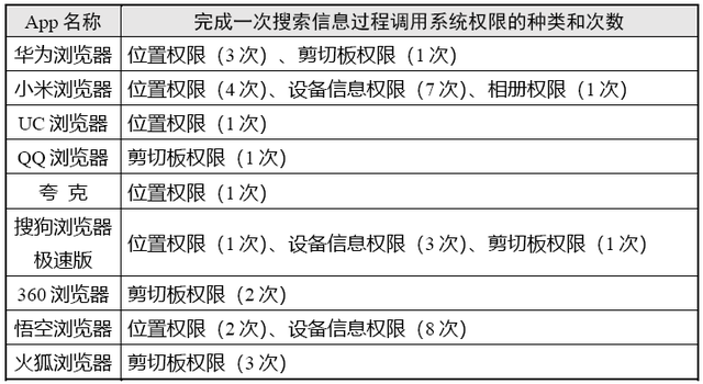 (2)在搜索信息场景中,调用系统权限种类最多的为小米浏览器和搜狗浏览器极速版(均为 3 类),调用系统权限次数最多的为小米浏览器(12 次)。具体情况如表 3。