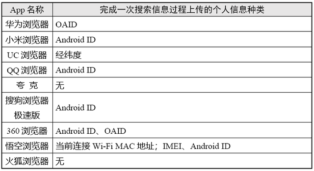 (1)在启动 App 场景中,个人信息上传种类最多的为 UC 浏览器(4 类)。具体情况如表 6。