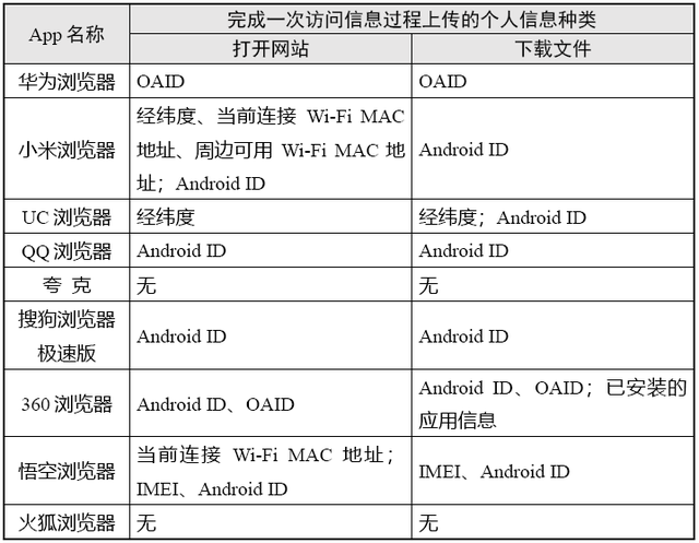 (3)在访问信息场景中,通过浏览器打开网站时,个人信息上传种类最多的为小米浏览器和悟空浏览器(均为 2 类);通过浏览器下载文件时,个人信息上传种类最多的为 UC 浏览器和 360 浏览器(均为 2 类)。具体情况如表 8。