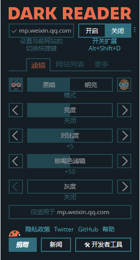 1. 查看插件,我们可以开启黑暗和明亮模式。同时,如果你对工具默认的亮度,对比度。滤镜以及灰度不是很满意的话,其支持用户自我调整。
