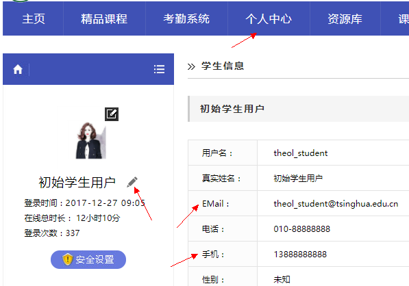同时在个人中心-学生信息中填写联系手机号码和邮箱地址,以便任课老师可以联系。