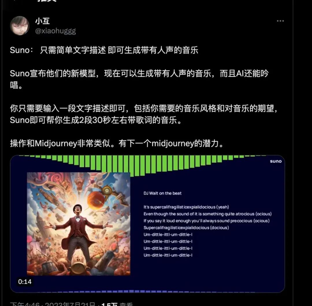 就像用midjourney进行绘画一样,使用Suno生成音乐也是非常轻松的过程。用户只需简单告诉AI他们想要的音乐风格和歌词内容,AI便能够根据这些提示生成一首完整的音乐作品。这让音乐创作变得无比简单,不再需要专业的音乐技能,每个人都能创造属于自己风格的音乐。