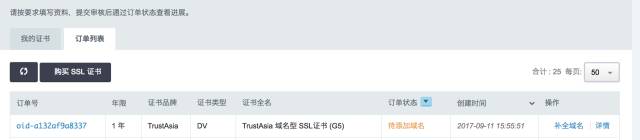 点击订单列表选择您的订单,点击补全域名。然后选择您需要签发的域名,并选择加密算法。