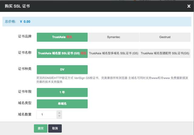 点击控制台左侧的安全 SSL 证书服务,选择需要的证书类型和证书品牌,点击确定。