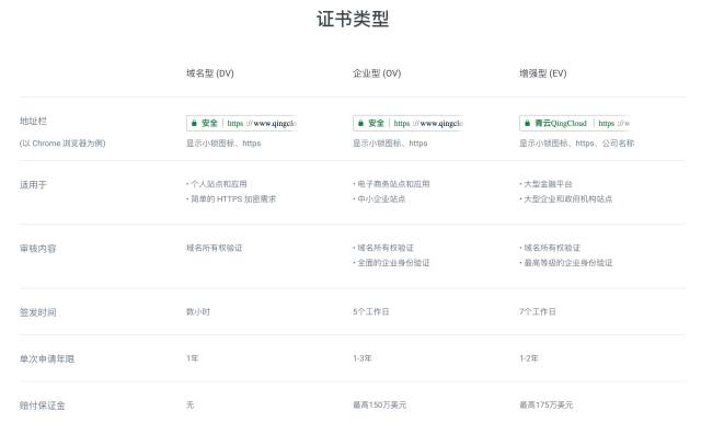 如上图所示,QingCloud 目前已经提供上述所有三种类型的证书,均由国际顶级 CA 数字证书机构(包括 Symantec 赛门铁克、GeoTrust、TrustAsia 亚洲诚信)授权颁发,保障数字证书的可靠性。