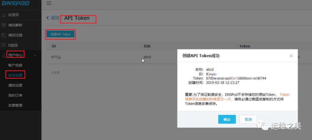 假设您的域名在 DNSPod 托管,登陆 DNSPod 后台,依次打开 用户中心 ->安全设置 -> API Token -> 查看 -> 创建 API Token -> 输入任意 Token 名称 -> 确定 -> 保存 ID 和 Token 值(图中打码部分)。