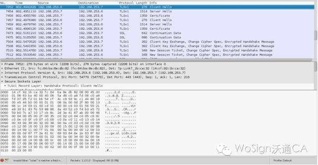 沃通CA认为:除了满足苹果ATS的要求外,正确配置HTTPS连接才能真正提高App的安全性。沃通CA曾针对我国一些热门App的HTTPS连接进行检测,结果显示已启用HTTPS连接的页面,98%不校验证书链和证书签发者,甚至不验证证书域名是否匹配,极易被黑客利用虚假服务器进行攻击,劫持加密流量。下图显示了某电商移动APP与虚假服务器完成SSL握手。