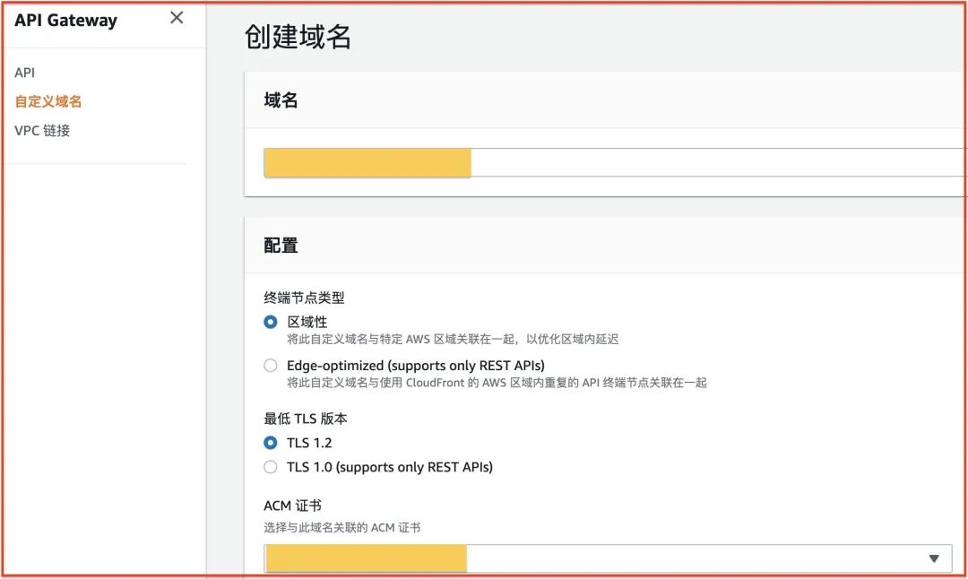 2、选择自定义域名,填入域名,创建区域性域名以及选择刚才创建的 ACM 证书。