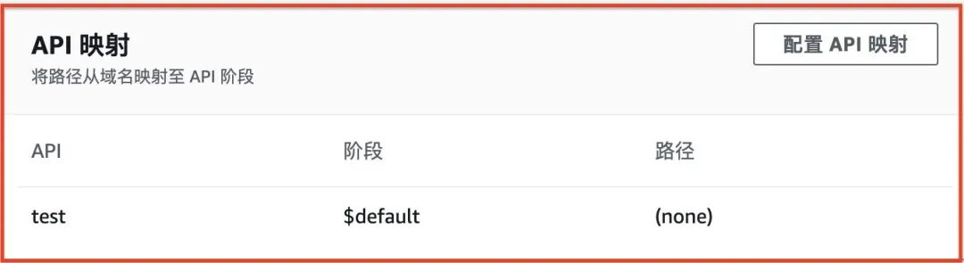 3、创建完成后,在 API 映射部分选择之前部署的 API Gateway,即 test API 选择阶段路径并保存。