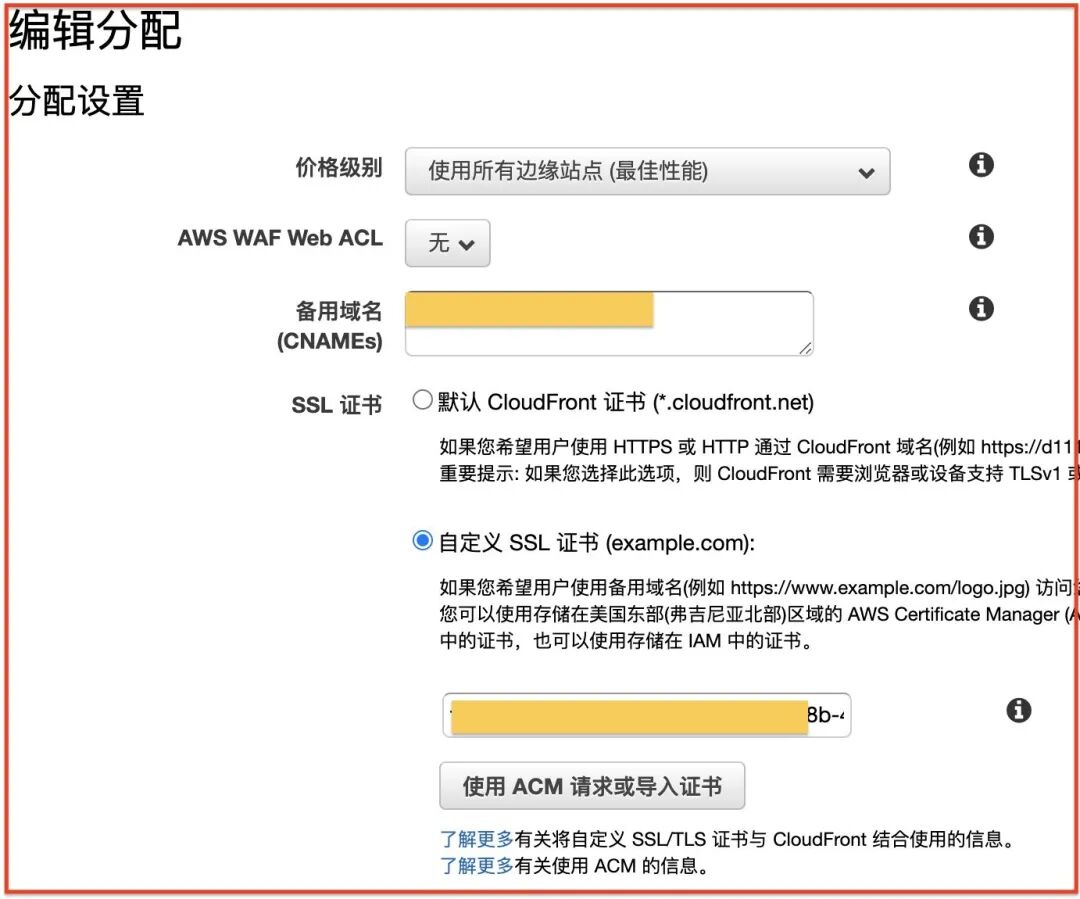 目前,中国区 CloudFront 暂不支持使用 ACM 公有证书,如有需要,可将第三方证书导入到 AWS IAM 中后,再启用 HTTPS 功能。