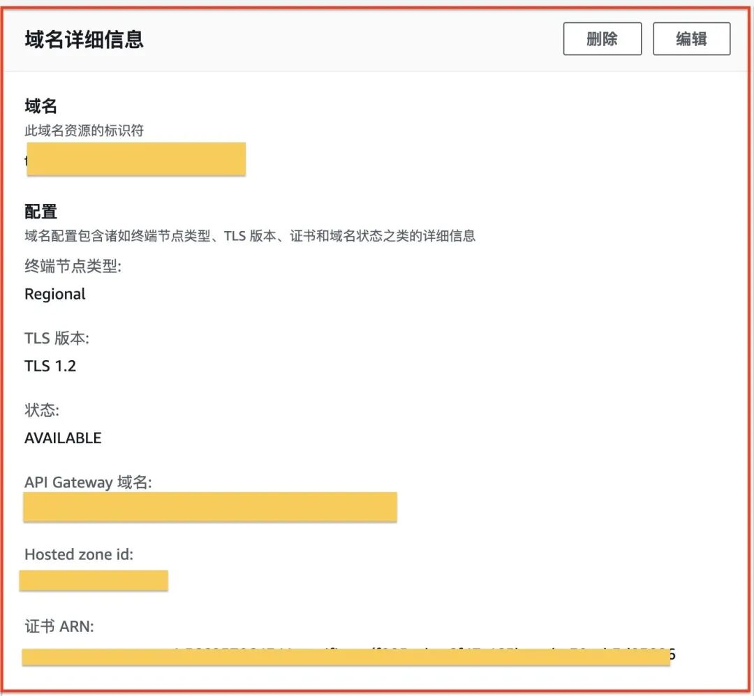 4、观察域名详细信息,记录下 API Gateway 域名。