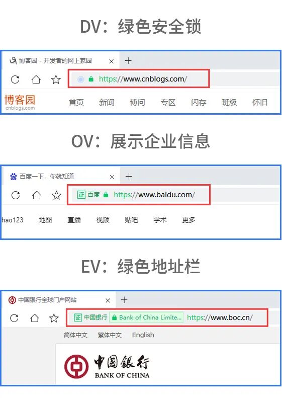 三种类型证书除了以上这些区别外,在不同浏览器的地址栏中,展示的样式也不同: