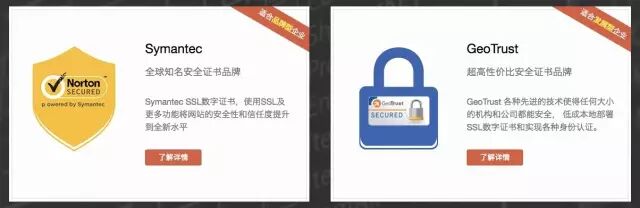 国内知名网址认证服务商 — 品牌宝旗下包括两大知名品牌Geo Trust、Symantec(赛门铁克)SSL证书,多选择价位满足所有客户的需求,最低每天不到6元钱,即可拥抱网站信息加密。Symantec SSL赛门铁克数字证书,作为全球知名安全证书品牌,适合品牌型企业需求,可以通过使用SSL及更多功能将网站的安全性和信任度提升到全新水平,并提供150万美元-175万美元赔付保障。GeoTrust,一款超高性价比的安全证书品牌,适合发展型企业需求,各种先进的技术使得任何大小的机构和公司都能安全, 低成本地部署SSL数字证书和实现各种身份认证,并提供125万美元-150万美元赔付保障。