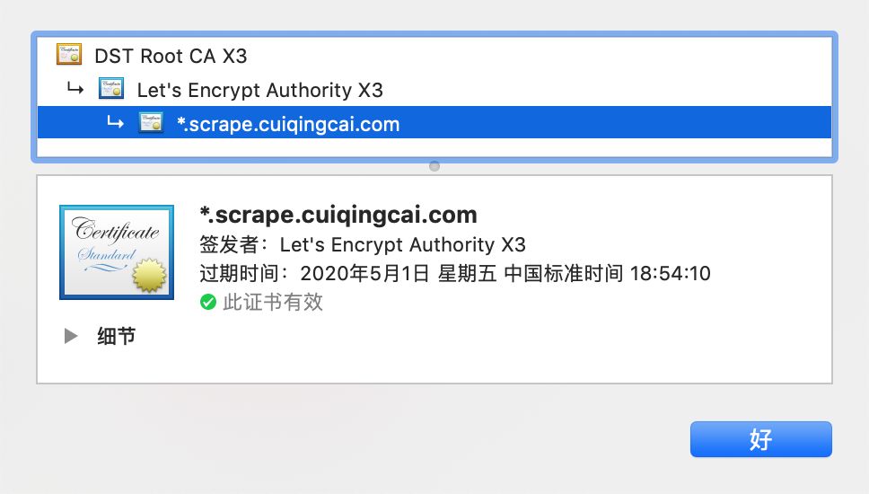 kubectl create secret tls tls-scrape-cuiqingcai-com-n scrape--cert*.scrape.cuiqingcai.com.crt--key*.scrape.cuiqingcai.com.keyLets Encrypt 的证书有效期是 90 天,为了实现自动化更新,我们可以上面的几步命令写到一个脚本,然后使用 crontab 直接运行就好了。