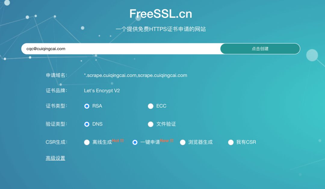 然后我就去找有没有免费的,找到了这么个网站:https://freessl.cn/,它可以申请免费的 SSL 证书,甚至泛域名的也可以,这个是 Lets Encrypt V2 颁发的,可以可以。