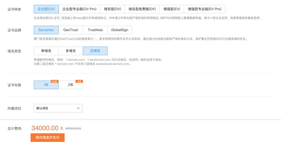 多少钱呢?分了好多种吧,有企业级 OV、增强型 EV、域名型 DV 等等,看看价格。