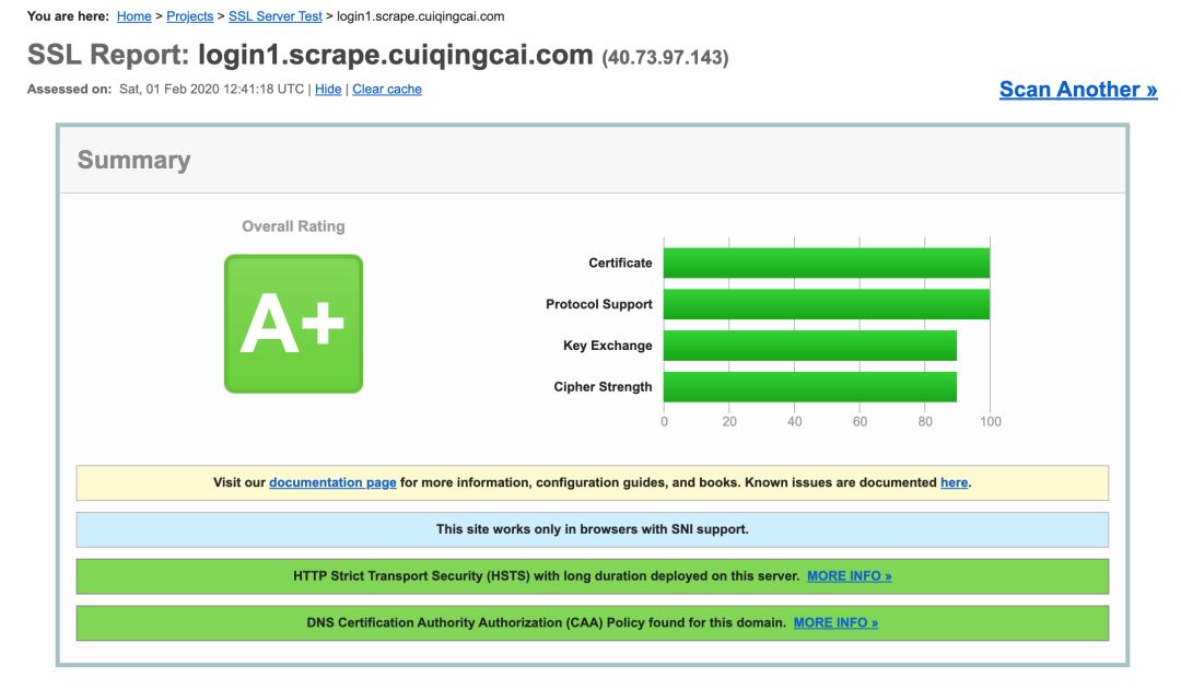 最后,大家的 SSL 证书情况可以到 https://www.ssllabs.com/ssltest/analyze.html 来检查下,检查一些配置的安全程度,介绍如下: