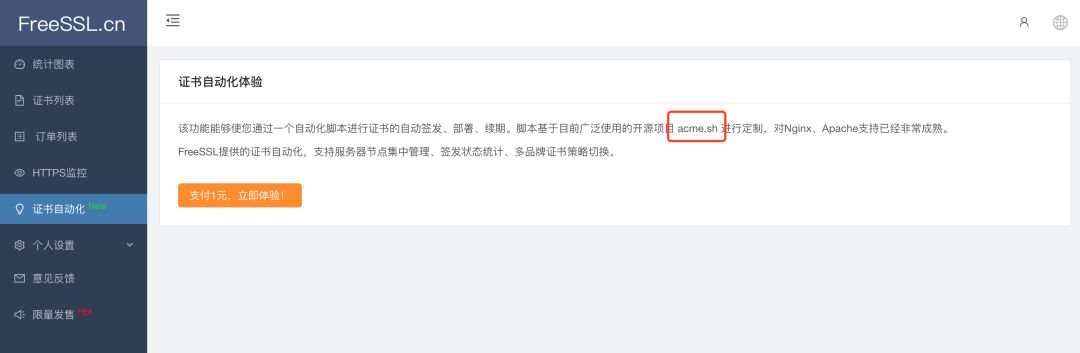 然后看了看控制台,发现这个网站它有这么个收费项目「证书自动化」,用的是 acme.sh 自动化,还收费一块钱。